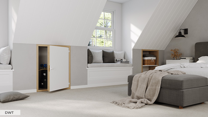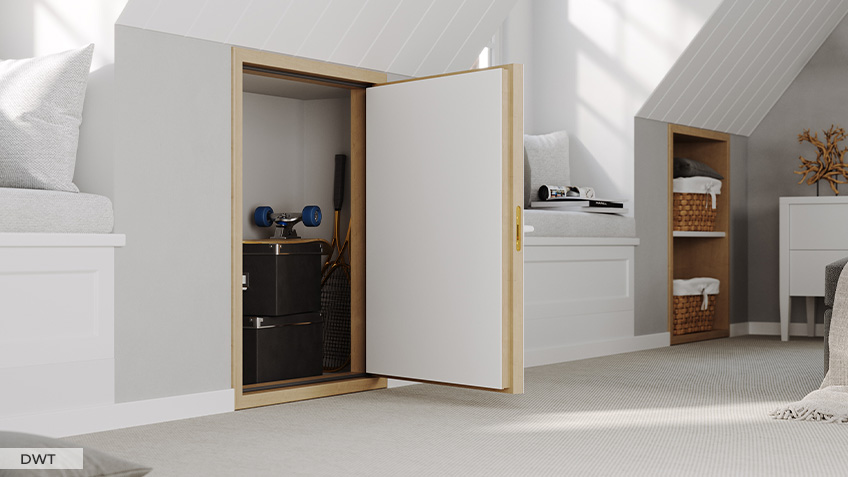 The DWT Knee Wall Access Doors are new and highly energy efficient design. The 2 5/8" thick sash fully filled with thermo-insulating material, provides an excellent barrier reducing heat loss (R-value 10). The doors as standard are equipped with handle and finishing lining. The doors can be installed in two versions of opening (right or left).